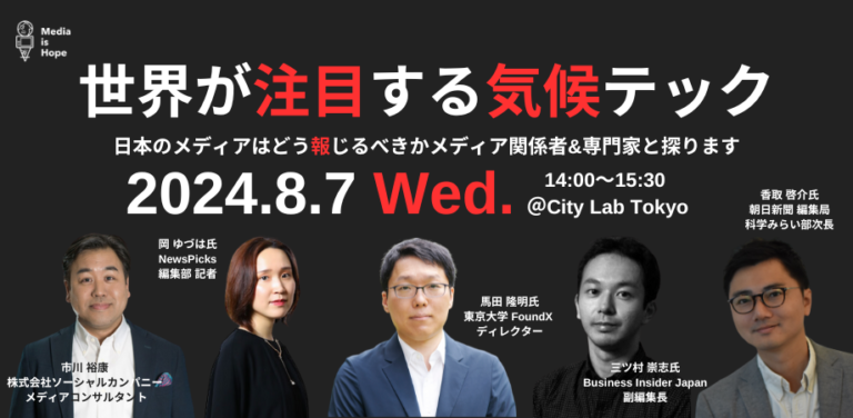 Climate Tech in the World’s Spotlight ~We Explore How Japanese Media Should Cover It with Media Represen … 続きを読む [Study Session for Media] Study Session on Climate Tech Will Be Held on Wednesday, August 7