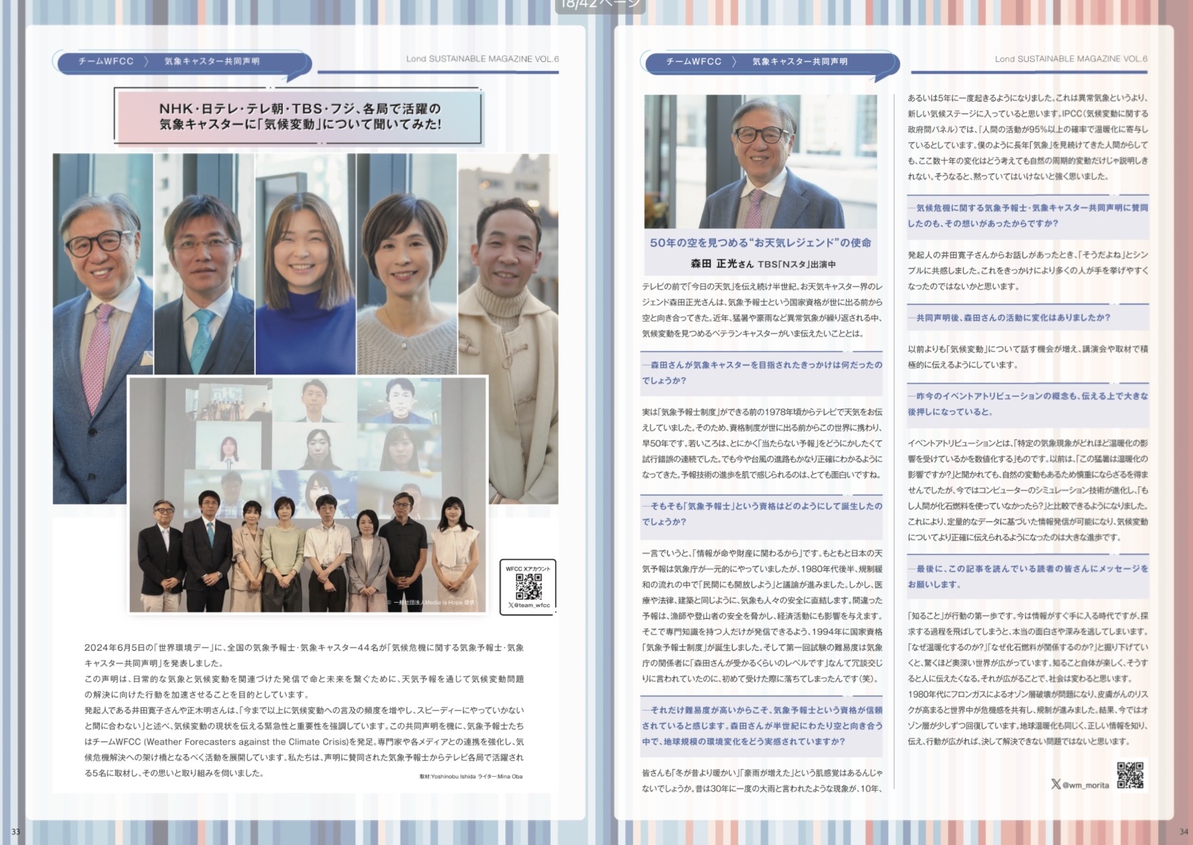 We interviewed well-known meteorologists and weathercasters from major broadcasting stations, Masamitsu Morita, Kimiharu Saita, Akari Yamagami, Ryoko Imamura, and Takeshi Amatatsu, who are supporters of “Team WFCC (Weather Forecasters against the Climate Crisis),” which was born from the “Joint Statement by Meteorologist and Weather casters on the Climate Crisis