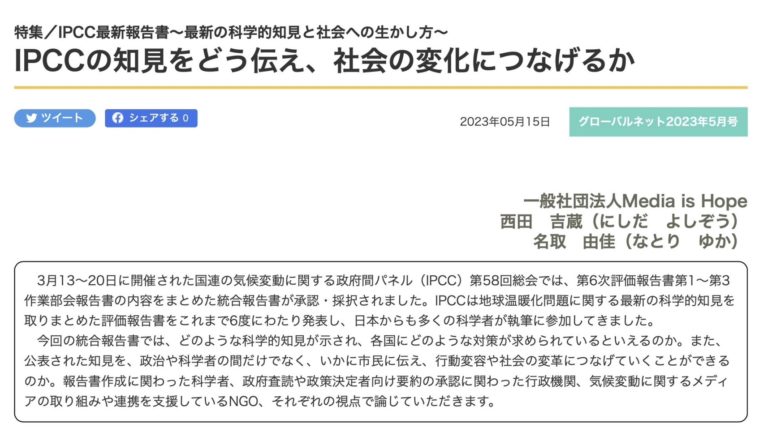 We at MEDIA IS HOPE have written down our thoughts on “how we can communicate the knowledge of the IPCC and use it to bring about social change,” including through interviews with stakeholders such as media professionals, citizens, and companies who are committed to tackling climate change on a daily basis.