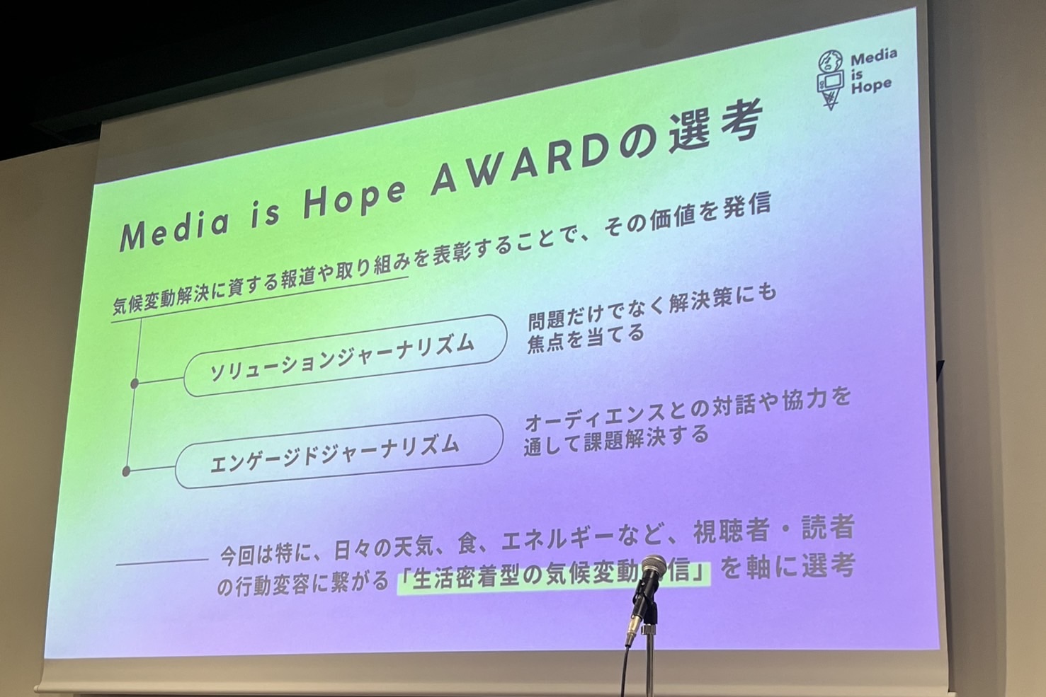 MEDIA IS HOPE Inc. promotes its value by awarding reporting and initiatives that contribute to solving climate change, such as solutions journalism, which focuses not only on problems but also on solutions, and engaged journalism, which solves problems through dialogue and collaboration with audiences.