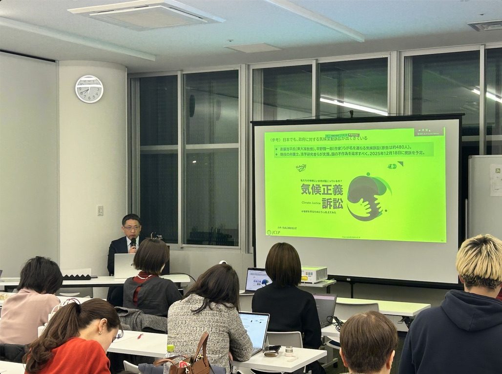また、気候変動への対応は自主的な「貢献・努力」から法的な「責任・義務」の世界へと変化していると指摘。変化の象徴として、国際司法裁判所(ICJ)が2025年に「気候変動対策は国の法的義務」とする勧告的意見を公表したことを取り上げました。また、国内での事例として2025年12月の「気候変動訴訟」に触れ、現役弁護士や法学研究者の支援を受け約480人が国を提訴したと紹介されました。